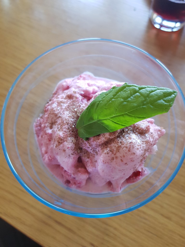 Schlagobers über die tiefgefrorenen Beeren gießen und mit einem Pürierstab vermixen, je nach Geschmack mit Zucker, Ahornsirup oder etwas Vanillejoghurt abschmecken und sofort genießen…es schmilzt nämlich sehr schnell….