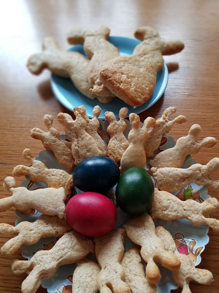 Mit einem Ausstecher Haserl oder Sonstiges ausstechen, auf ein Backblech legen und mit Milch bestreichen.