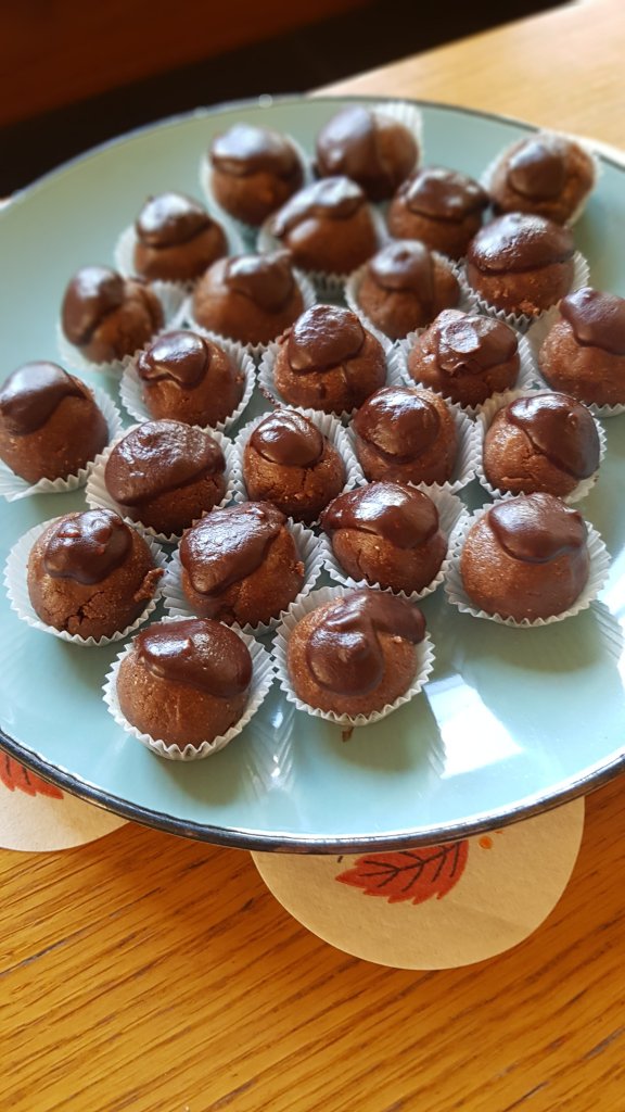 Alle Zutaten verkneten und Kugeln formen. Schokolade im Wasserbad schmelzen und jeweils einen kleinen Tupfer Schokolade auf die Tsampakugel geben.