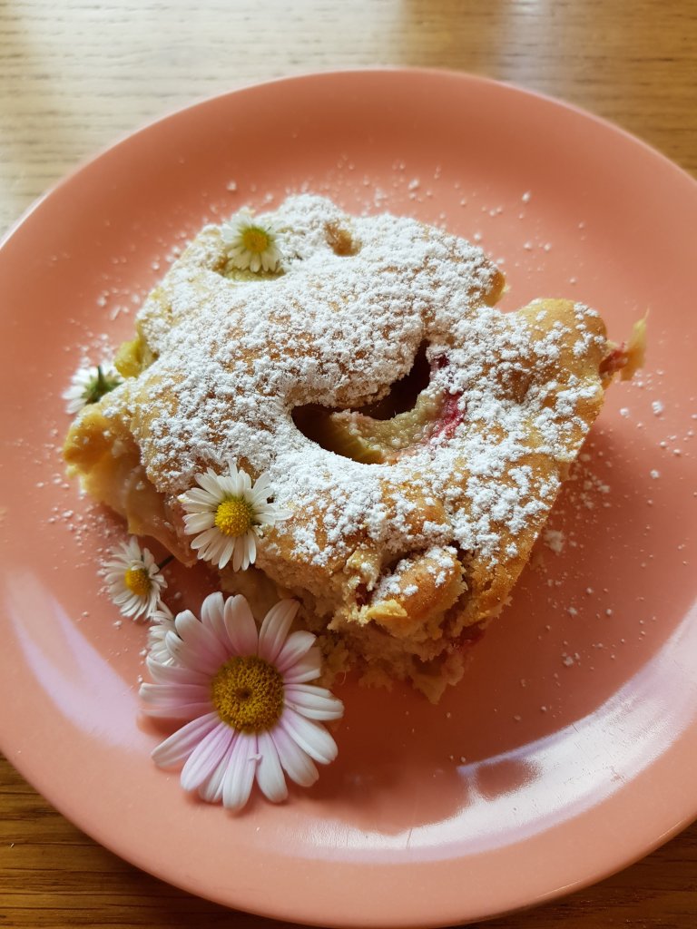 Mehl und Milch abwechselnd dazugeben und zu einem gleichmäßigen Teig verrühren. Rhabarberstücke mit einem Kochlöffel unterheben und die Masse in eine Form geben (22 cm Durchmesser) – die Rhababerstücke in die Teigmasse drücken, damit sie beim Backen nicht braun werden.