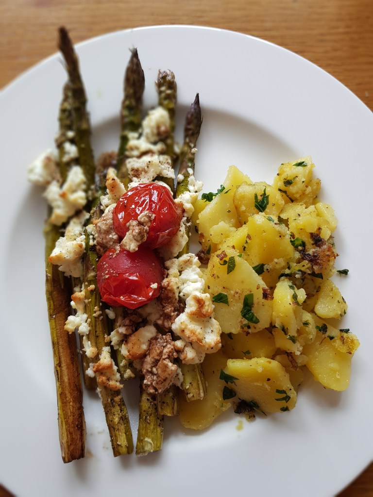 Den Spargel im vorgeheizten Backrohr bei 200 Grad Heißluft für ca 30 min braten währenddessen einige Male wenden. Nach ca. 20 min den Schafskäse über den Spargel bröseln und nochmal 10 min weiterbraten.