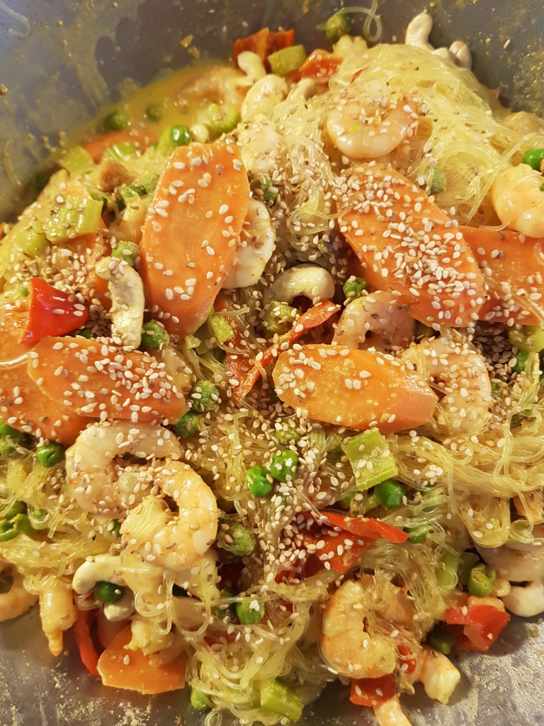 Glasnudeln nach Packungsanleitung kochen und abseihen, dann mit den Cashewnüssen mit einer Gabel unter die Wokgemüse-Shrimpsmischung ziehen. Ev. nochmals nachwürzen und mit Sesam bestreuen.