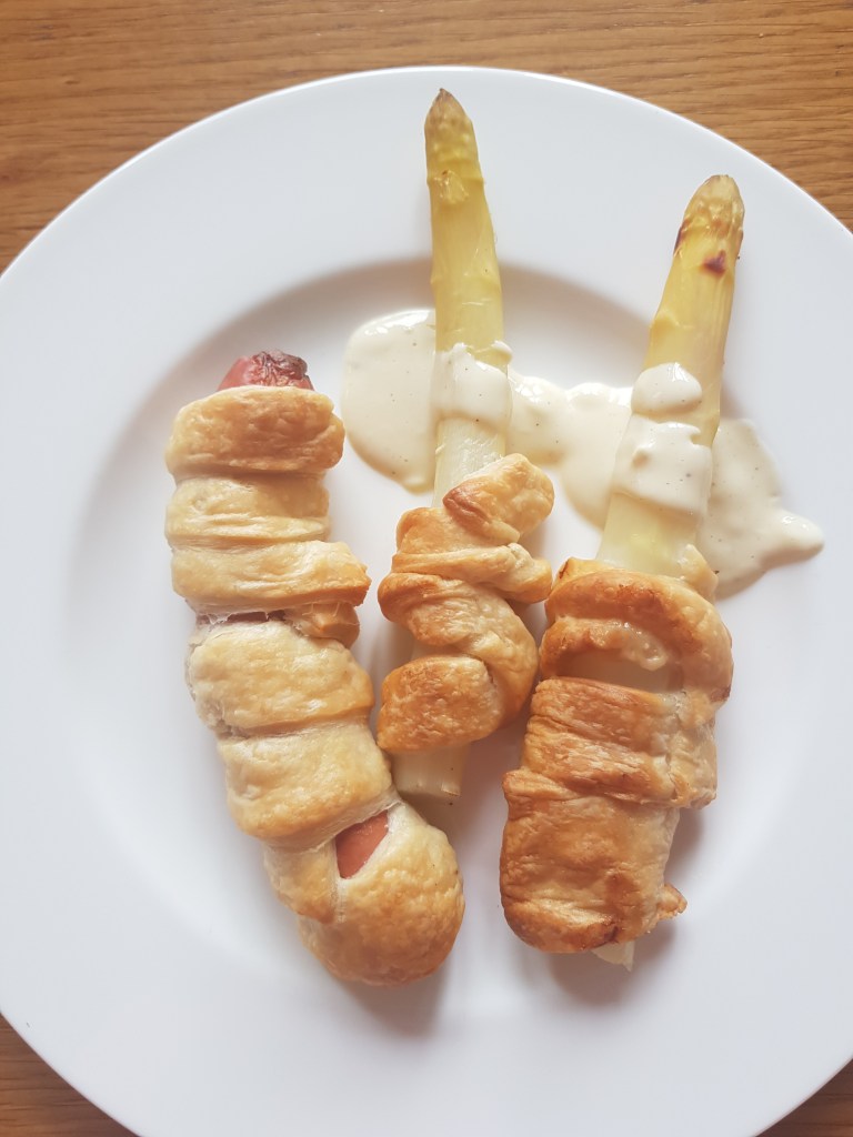 Blätterteig in ca. 2 cm breite Streife schneiden und die Würstel, sowie die Spargelstangen damit einwickeln.