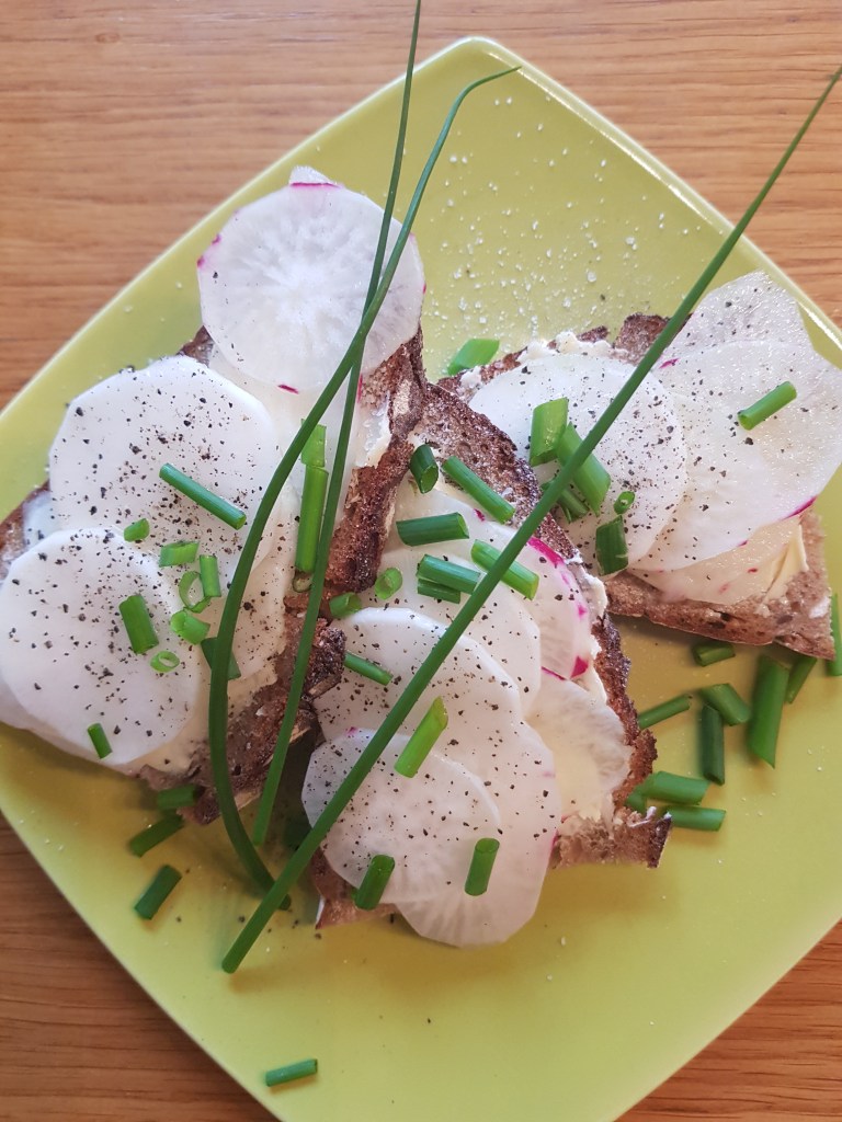 Rettich schälen, fein blättrig hobeln und mit reichlich Salz kurz mit der Hand durchmischen und ca 15 min ziehen lassen. Eventuell nochmals nachsalzen, auf die vorbereiteten Butterbrote legen und mit Pfeffer und Schnittlauch garnieren.