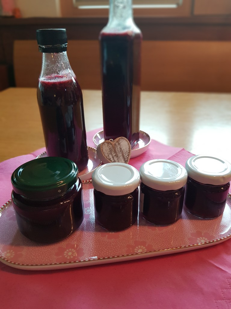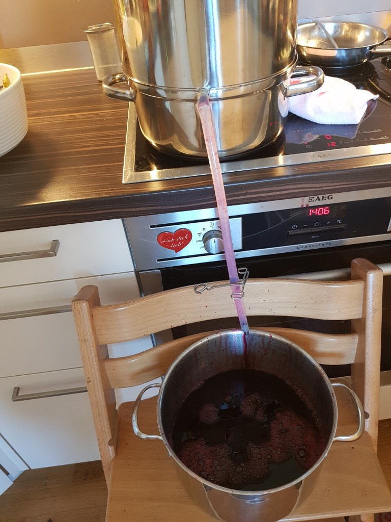 Dieser Vorgang dauert ca 1- 2 Stunden. Die Ribisel immer wieder gut umrühren. Wenn der gesamte Saft im Topf ist, abwiegen und mit der gleichen Menge Sirupzucker aufkochen lassen und in Flaschen füllen und kühl lagern.