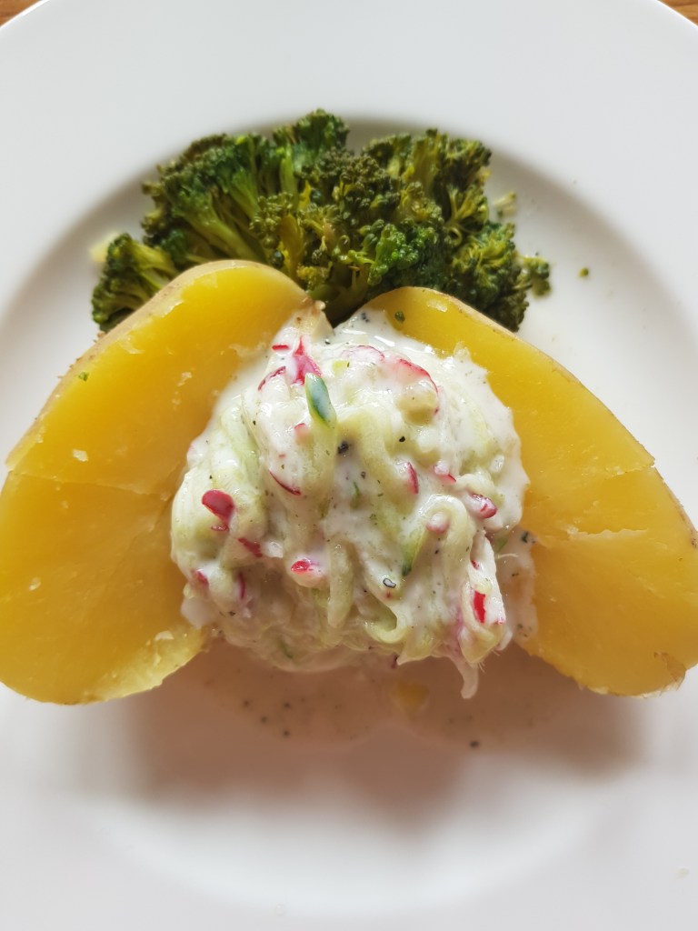 Joghurt und Sauerrahm mit der Gurken-Radieschenmasse vermengen und mit Salz, Pfeffer, Knoblauch und Zitronensaft abschmecken.