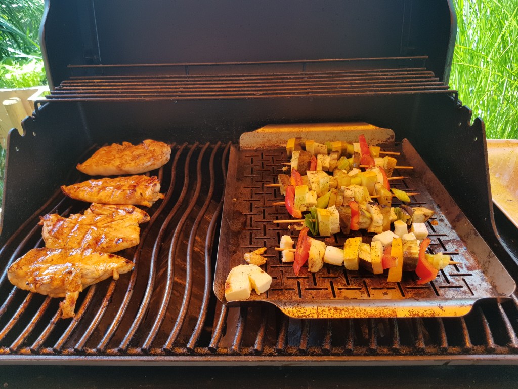 Hendlfilet und Gemüsespieße am Grill grillen und mit Cocktailsauce und grünem Salat genießen.