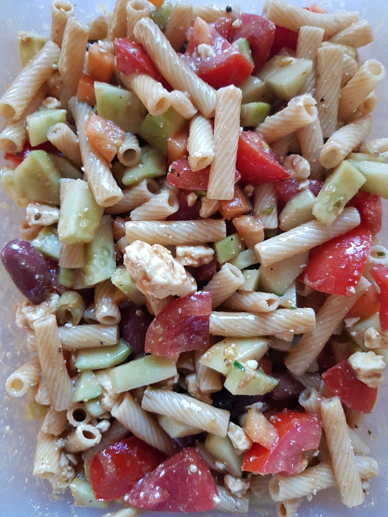 Nudeln nach Packungsbeilage kochen und kalt abschrecken. Gemüse waschen, klein schneiden und mit den Nudeln, dem fein zerbröselten Schafskäse und den Oliven vermengen und je nach Geschmack mit Balsamico, Olivenöl, Salz und Pfeffer abschmecken.