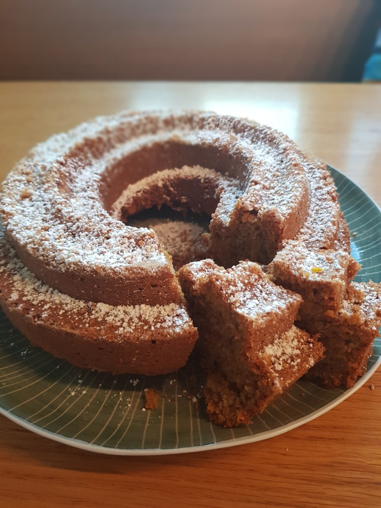 Die Eier mit Butter und braunem Zucker schaumig rühren. Dinkelmehl mit Backpulver und Zimt vermengen und abwechselnd mit den geriebenen Mandeln unterheben. Zum Schluss das geriebene Kürbisfruchtfleisch hinzugeben.