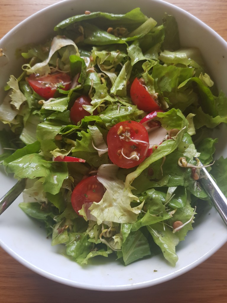 Die Sprossen müssen dann täglich einige Male gewaschen und abgetropft werden. In 3 – 4 Tagen sind sie fertig und können dann genossen werden. Ich streue sie gerne über den Salat oder über eine Suppe.