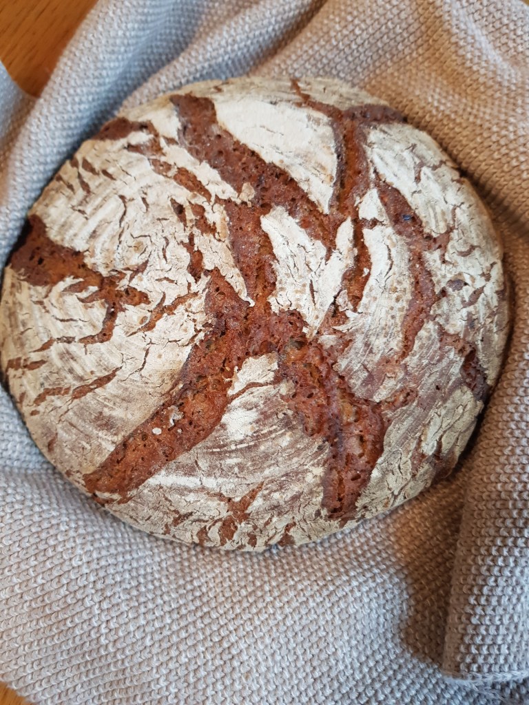 Alle Zutaten mit der Hand oder mittels Rührwerk langsam auf niedriger Stufe mischen und anschließend zu einem geschmeidigen Teig kneten. Den Teig zu einer Kugel formen und in einem Weidling 80 min. zugedeckt rasten lassen, durchkneten und in ein bemehltes Gärkörbchen geben und nochmals 45 min. aufgehen lassen.