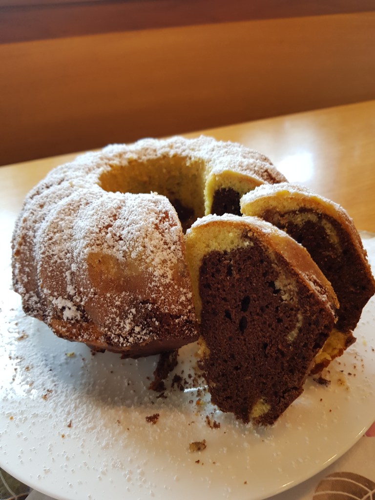 Eier mit Staub- und Vanillezucker schaumig rühren. Das Mehl mit dem Backpulver verrühren und abwechselnd mit dem Schlagobers zur Teigmasse geben. Zitronenschale unterheben und ca. die Hälfte des Teiges in die Gugelhupfform leeren. Den Rest des Teiges mit Kakaopulver vermengen und vorsichtig mit einer Gabel marmorieren.