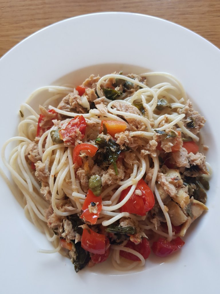 Pfanne erhitzen, einen guten Schuss Olivenöl hineingeben, Knoblauch darin kurz anrösten und danach das Gemüse und die Kräuter für einige Minuten mitrösten und den Zitronensaft dazugeben. Zum Schluss den Thunfisch hinzufügen.