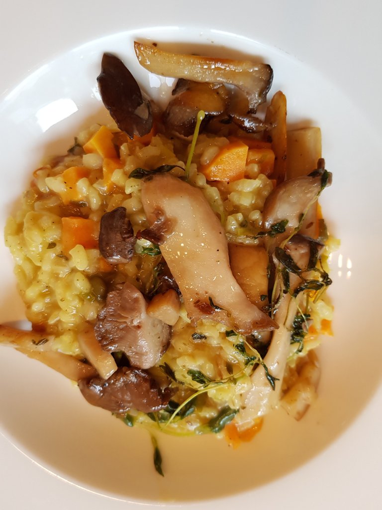 Kräuterseitlinge in Olivenöl kurz scharf anbraten, salzen und pfeffern und mit dem Risotto anrichten.