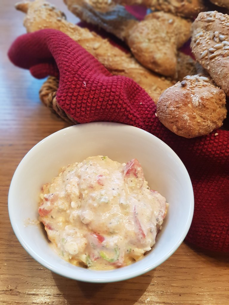Vollkornweckerl mit Aufstrich bestreichen und mit gehackten Walnüssen servieren.