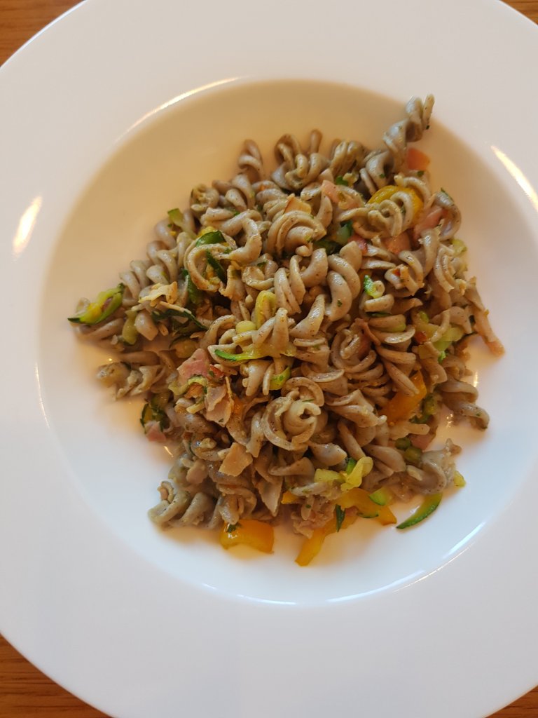 Schinken und Paprika klein würfelig schneiden. Öl in einer Pfanne erhitzen, Paprika und Schinken anrösten, Zucchini dazugeben und kurz weiterrösten. Die Nudeln vorsichtig daruntermischen, mit Salz, Pfeffer und Paprikapulver würzen und mit Kräutern bestreuen.