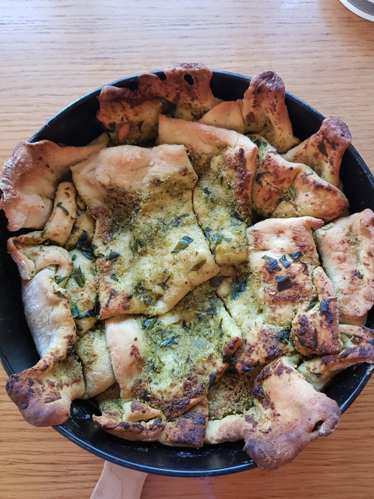In Anlehnung an Christina Bauers Zupfbrot, habe ich passend zur Jahreszeit die Fülle mit einem Glas Bärlauchpesto und einer Hand voll geschnittener Bärlauchblätter verändert! Schmeckt herrlich- Achtung! Draculageruch…..