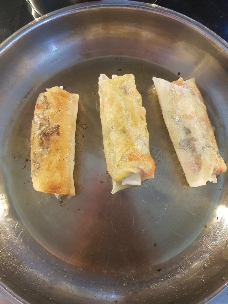 Die fertig eingerollten Frühlingsrollen in Rapsöl von allen Seiten anbraten und auf einer Küchenrolle abtropfen lassen.