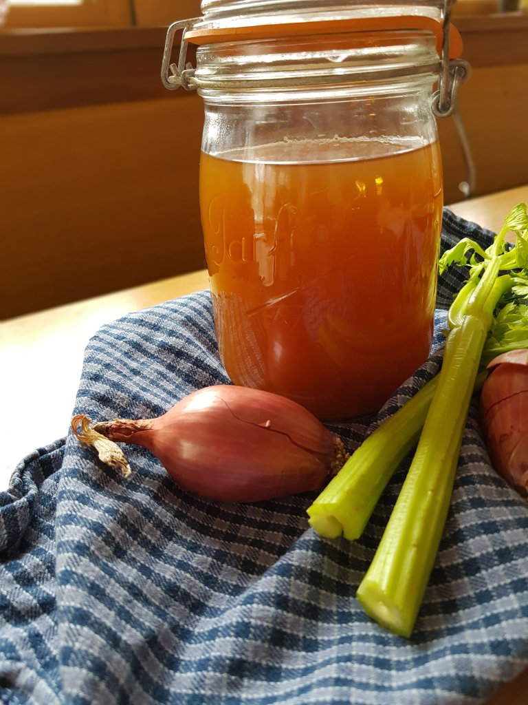 Der Gemüsefond kann in Einkochgläsern im Kühlschrank gelagert oder auch eingefroren werden.
