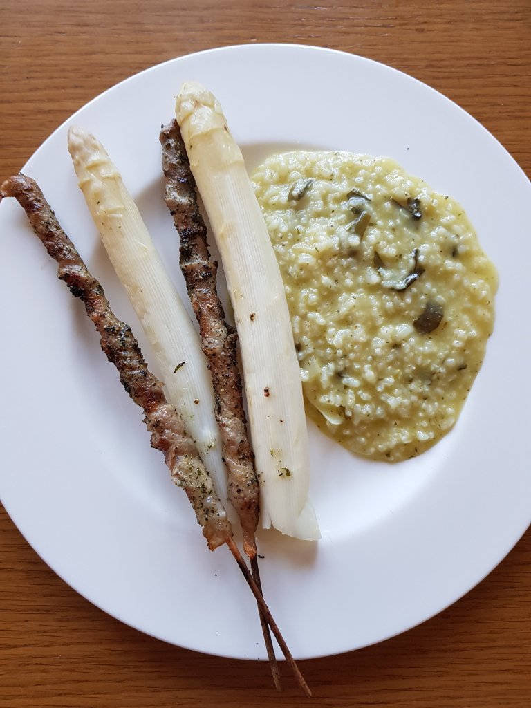 Für das Risotto den Reis heiß abspülen und in wenig Olivenöl kurz anrösten und mit Weißwein ablöschen mit etwas Gemüsebrühe aufgießen. Abschließend die Zwiebel im Ganzen dazugeben, das Lorbeerblatt und das Risotto unter ständigem Umrühren immer wieder mit Gemüsebrühe aufgießen und dahinköcheln lassen.