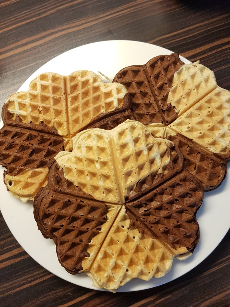 Für jede Waffel von jeder Teighälfte 1 bis 2 Kleckse im Wechsel in das Waffeleisen geben und die Waffeln ausbacken.