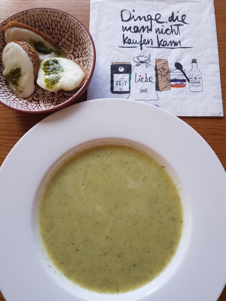 Die Suppe mit einem Schuss Schlagobers verfeinern, etwas salzen und mit einem Pürierstab fein pürieren und mit den Mozzarellakornspitzen anrichten.