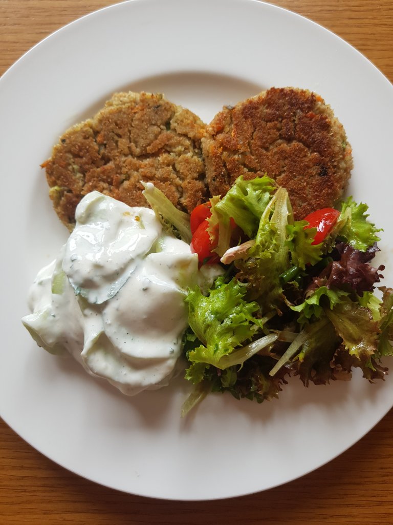 Laibchen formen und jede Seite einmal in Semmelbrösel drücken, anschließend in Rapsöl beidseitig abbraten und mit Salat servieren.