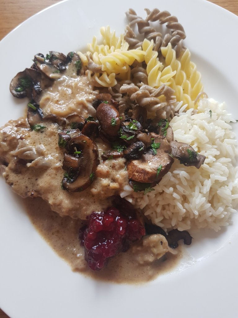 Anschließend in einer Pfanne etwas Rapsöl erwärmen und die Schnitzel beidseitig scharf anbraten und wieder aus der Pfanne geben. Zwiebel fein nudelig schneiden und in der gleichen Pfanne mit etwas Öl braun anrösten und mit Rindsfond, Schlagobers und Wasser aufgießen. Danach die Schnitzel wieder in die Sauce legen und mit Salz und Pfeffer würzen und für ca. 30 min leicht köcheln lassen.