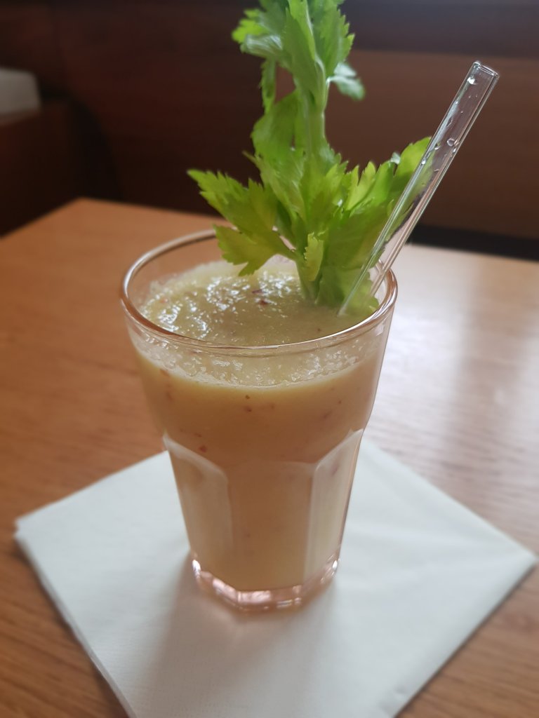 Alle Zutaten mit einem Smoothiemixer oder auch mit einem Pürierstab fein zerkleinern und sofort trinken.