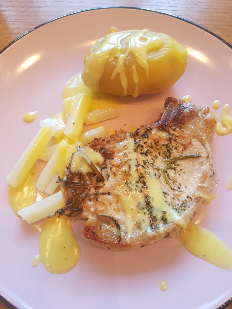 Die Kotletts mit dem Spargel, den Kartoffeln und der Sauce Hollandaise anrichten und mit Salz und Pfeffer bestreuen und genießen!
