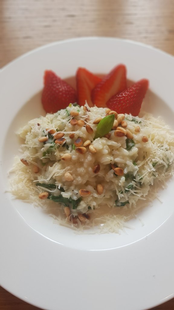 Danach das Risotto mit Parmesan, Erdbeeren, Pinienkernen und Bärlauchknospen anrichten und genießen!