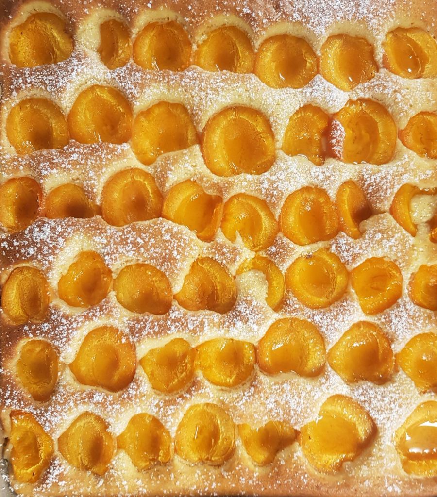 Zuerst die Butter cremig rühren, dann den Zucker und Vanillezucker dazugeben und cremig rühren. Anschließend die Eier nach und nach unterrühren und das mit Backpulver vermengte Mehl abwechselnd mit der Milch zum Teig geben und die Masse auf ein mit Backpapier ausgelegtes Backblech verteilen und mit Marillen je nach Belieben belegen.