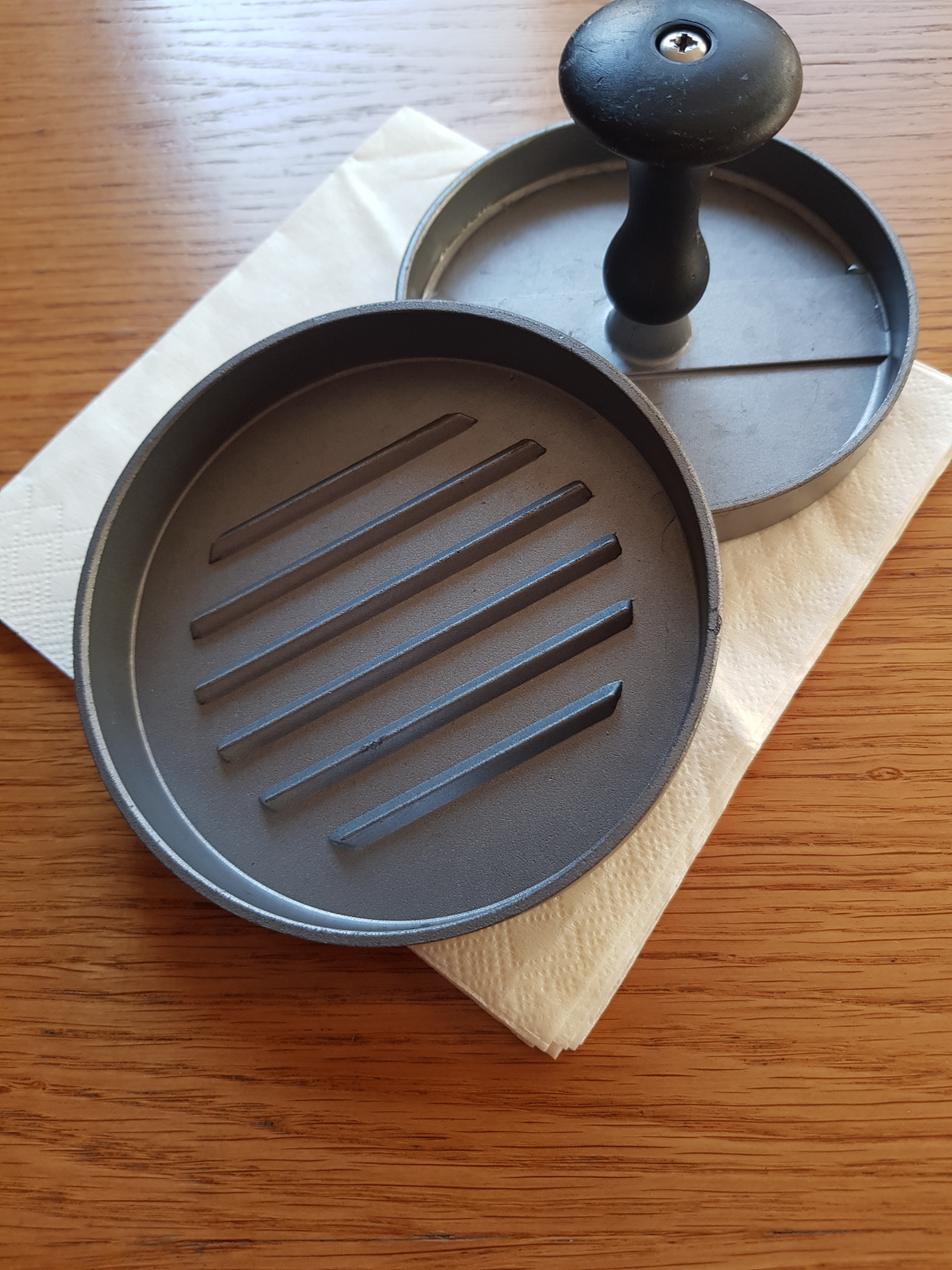Faschiertes in 4 gleich große Teile teilen und mit einer Burgerpresse Laibchen pressen. (mit Backpapier auslegen)